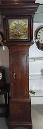 Nicely proportioned walnut veneer case with a slim trunk and marquetry inlaid start to door and front panel